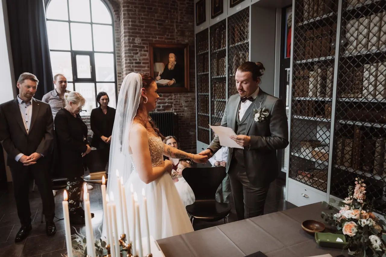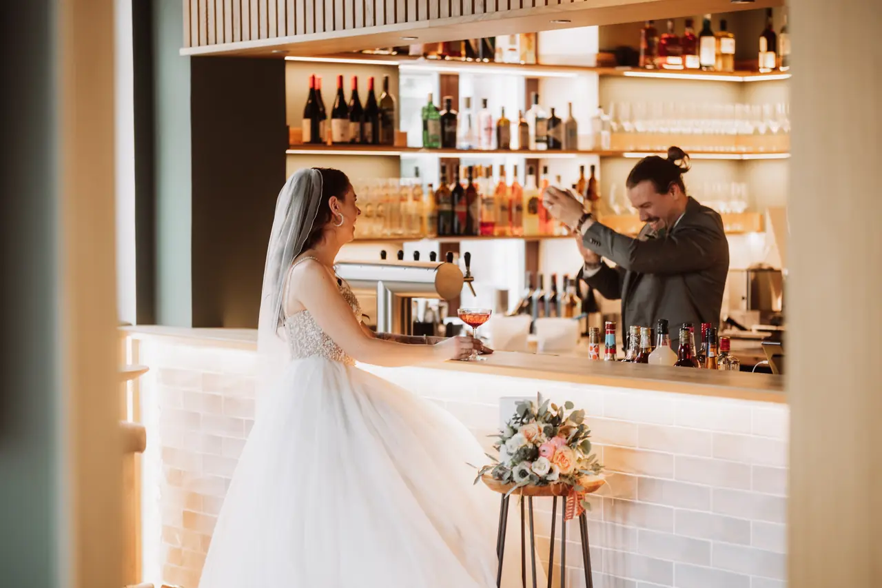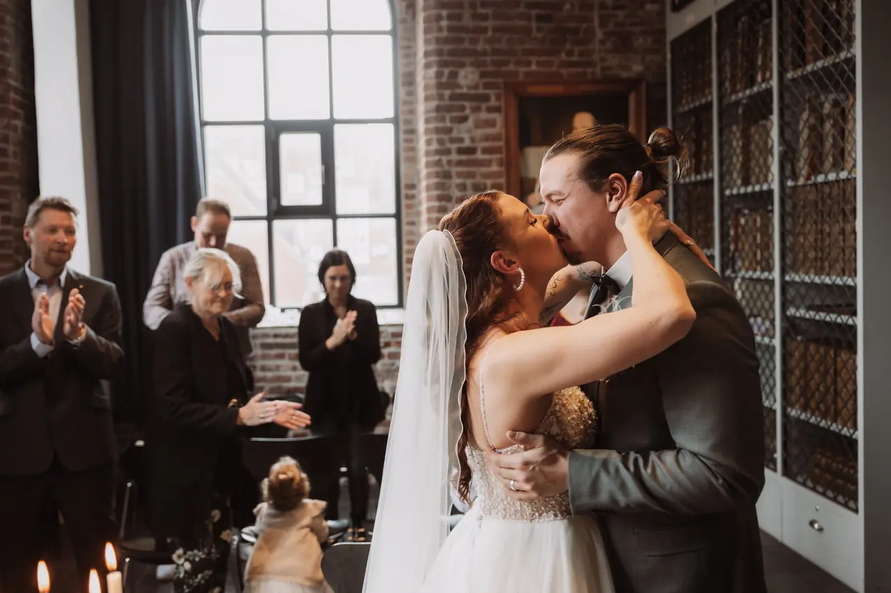 Maike und Patrick haben im kleinen Kreis gefeiert, aber besonderen Wert auf Eleganz und Qualität gelegt. Ich war von der ersten Minute bei getting ready dabei und durfte miterleben, wie nicht nur die Mama, sondern auch ihre Tochter juna zur kleinen Braut wurde. In der Johannes a Lasco Bibliothek in Emden fand der First Look des Brautpaares und die sehr emotionale Trauung statt, bei der ich natürlich auch wieder selbst ein Taschentuch benötigt habe. Bevor es zur Feier ging, haben wir in der eigenen Bar, die Havenbar in Emden, noch das Brautpaarshooting inkl. leckerer Cocktails gemacht. Die Feier fand dann in der eleganten Hochzeitsscheune von Haase Catering in Riepe statt und dort wurden alle Kulinarisch mit Livecooking und allem, was das Herz begehrt, verwöhnt. Das war wirklich das beste Hochzeitsessen in dieser Hochzeitssaison!